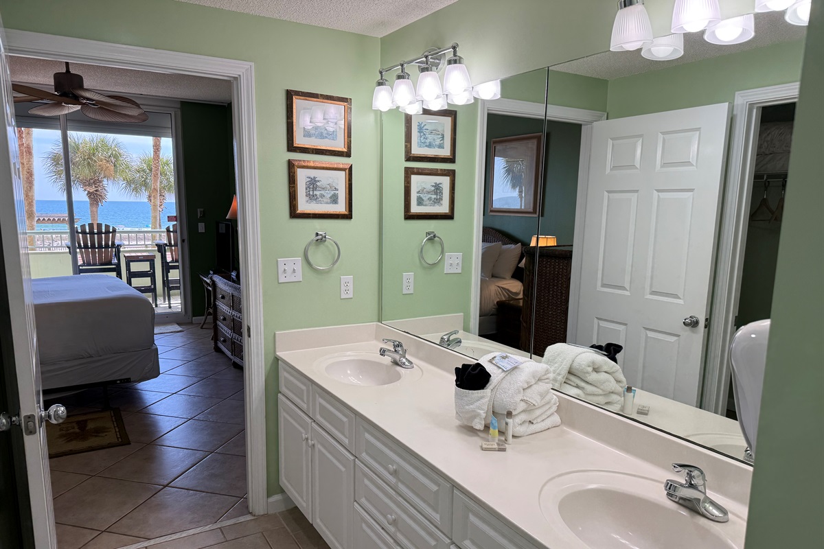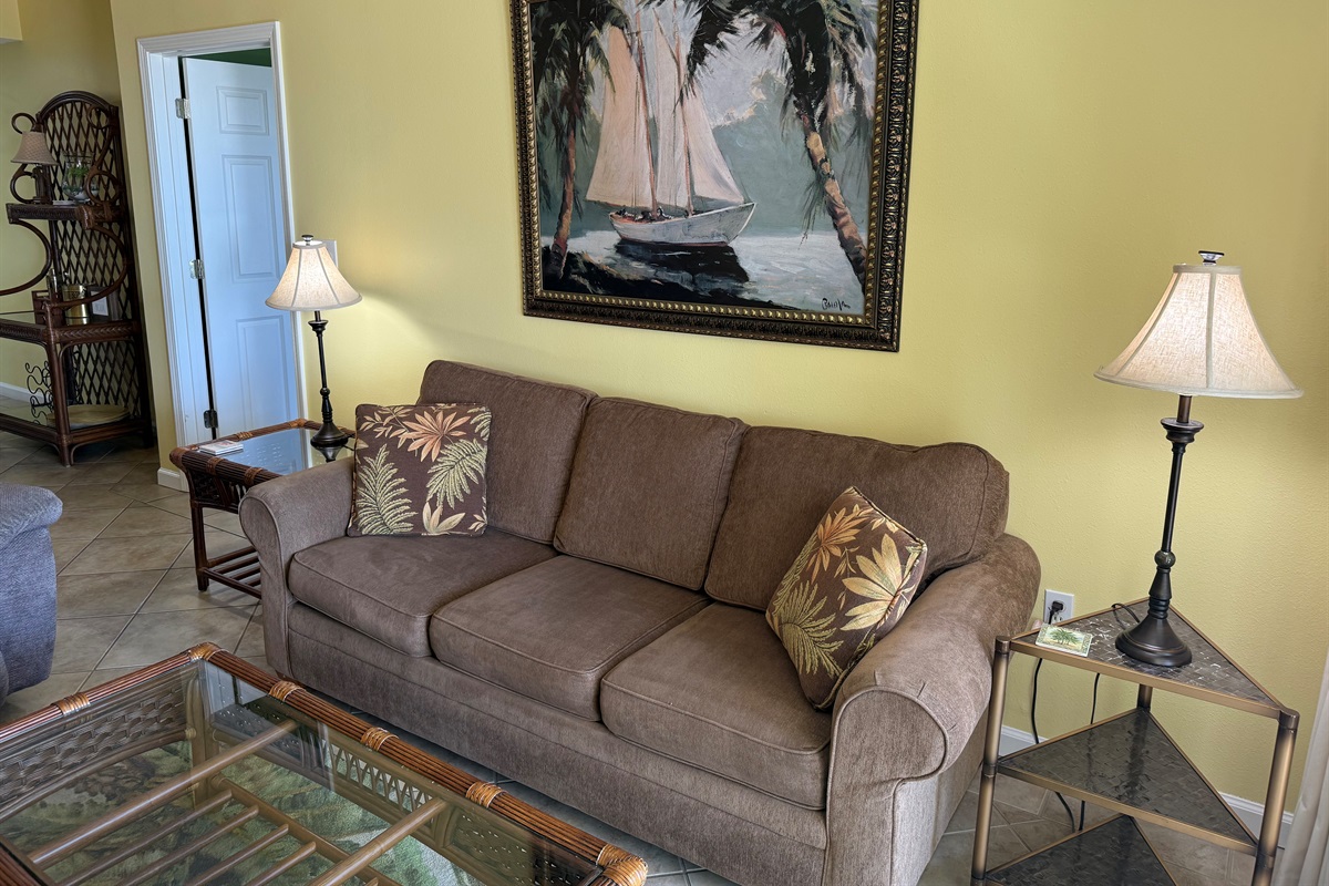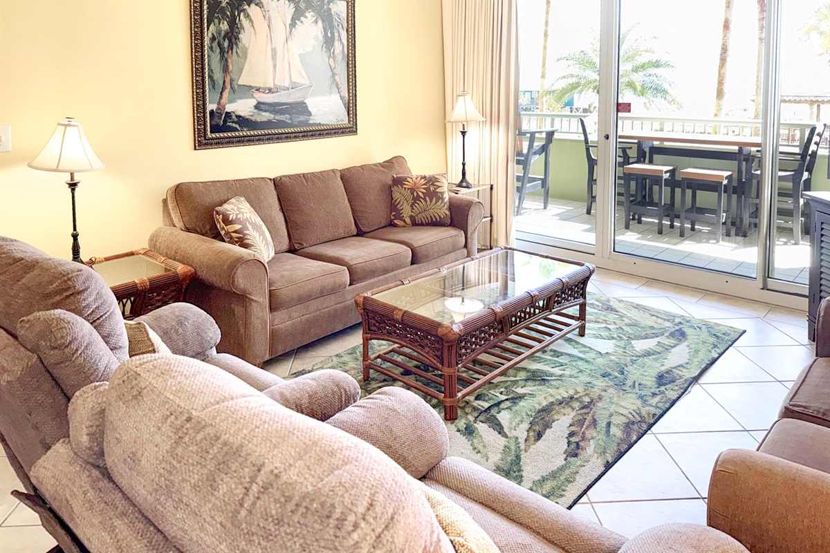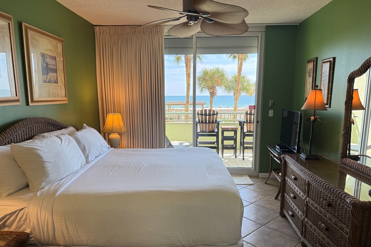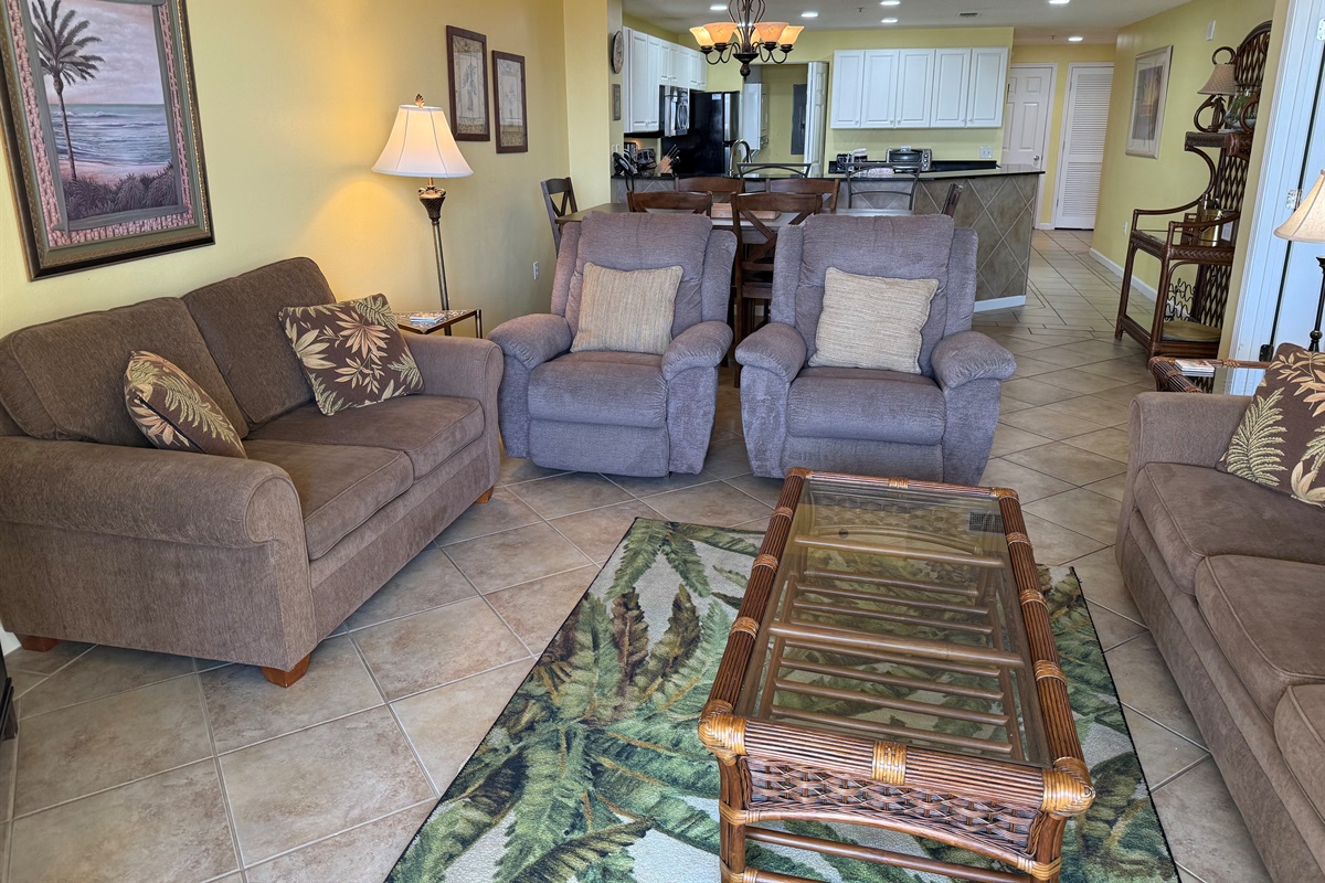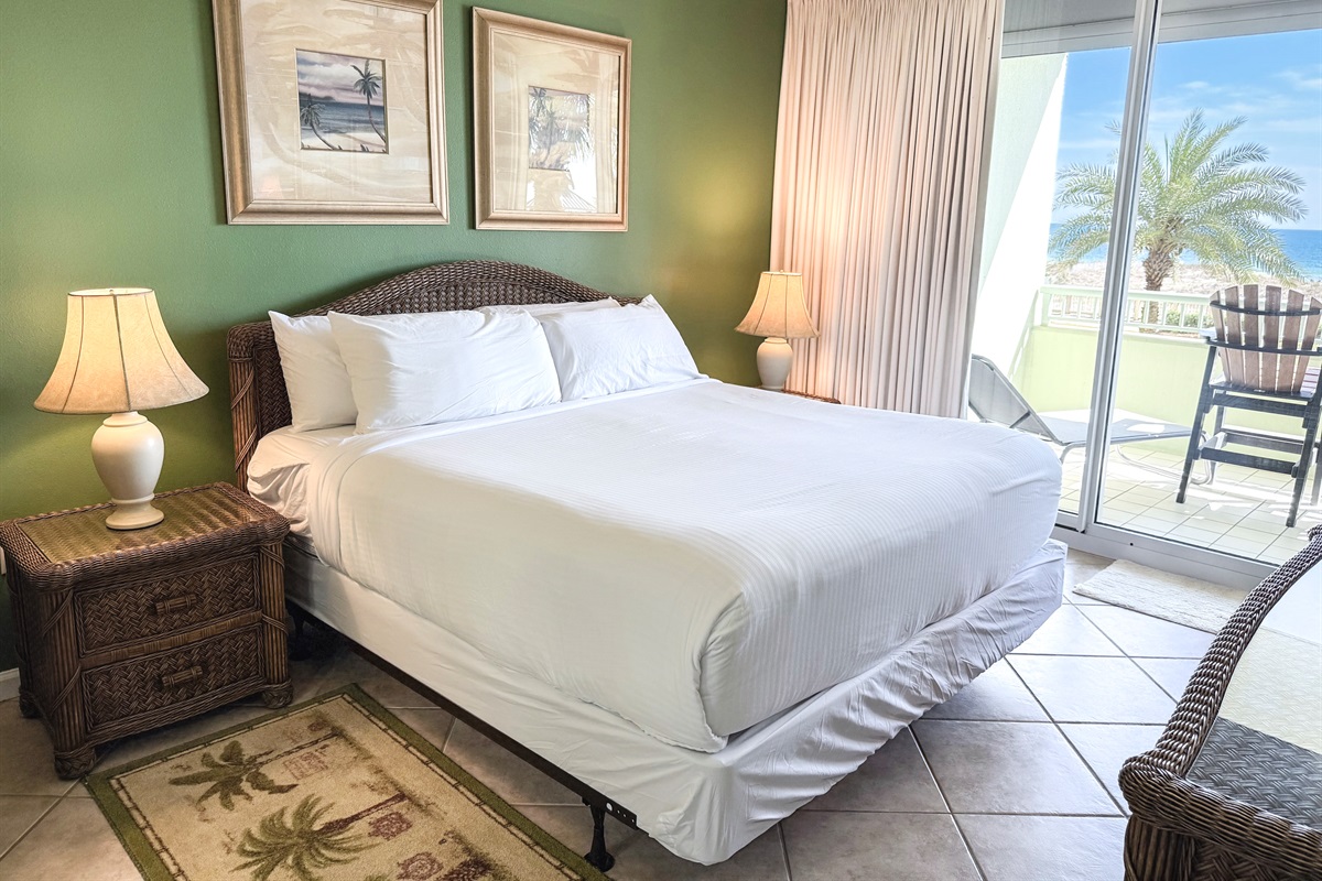 Bedding arrangement is King Master, 2 twin beds, plus a sofa sleeper. All privately adjoin a full bath, plus there is a hall half bath. The master bedroom and the living room adjoin the balcony with a direct Gulf View!