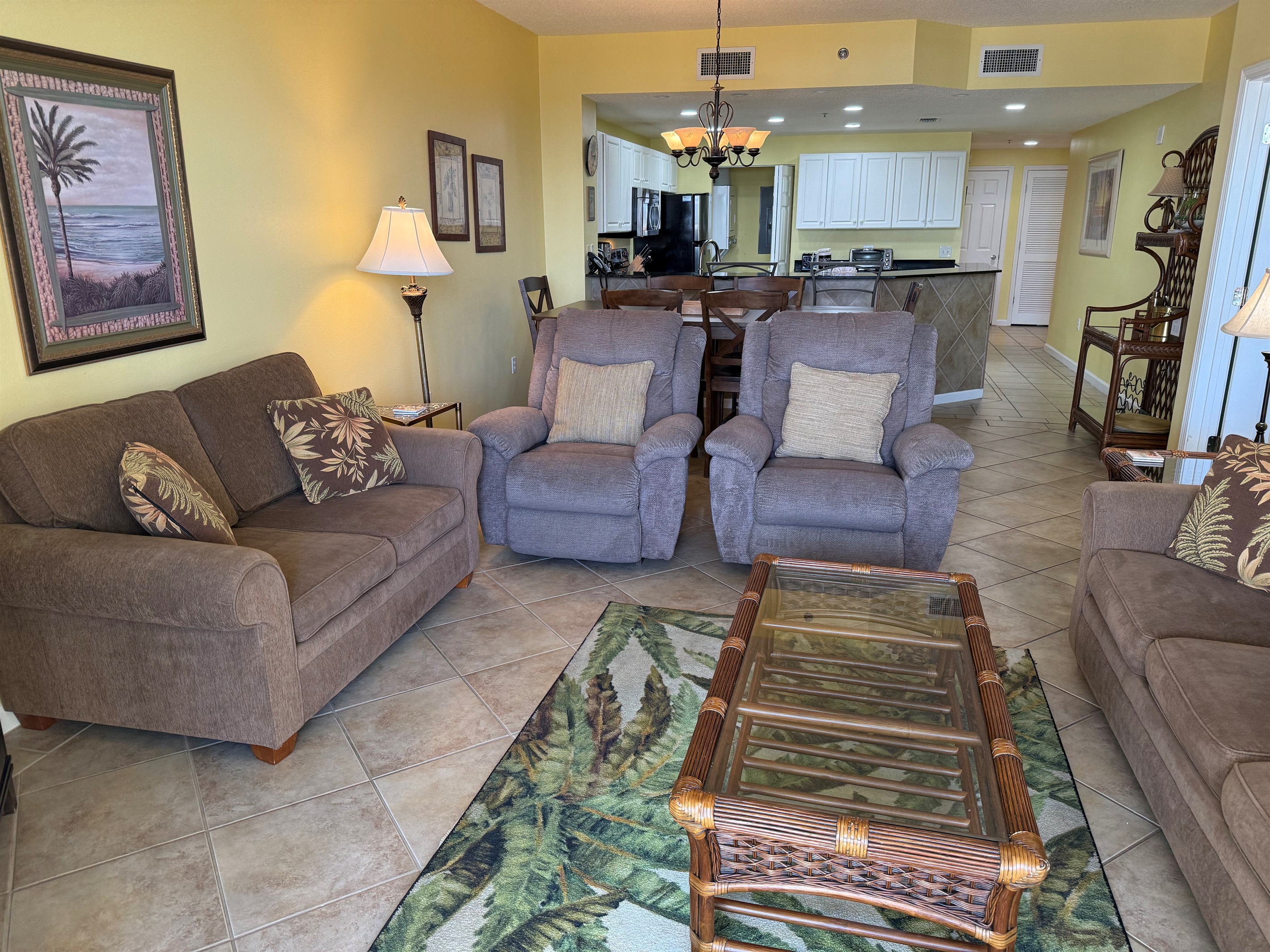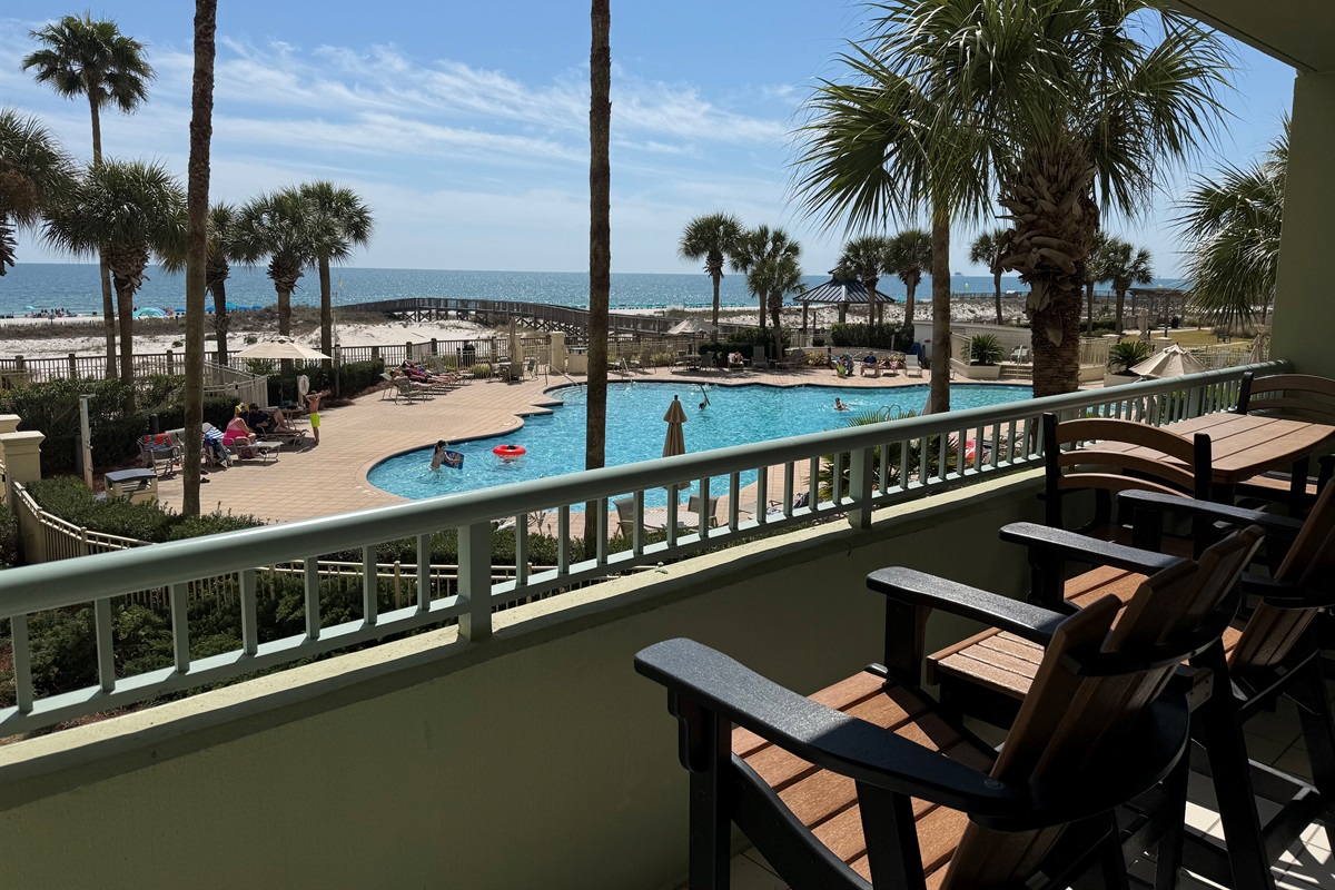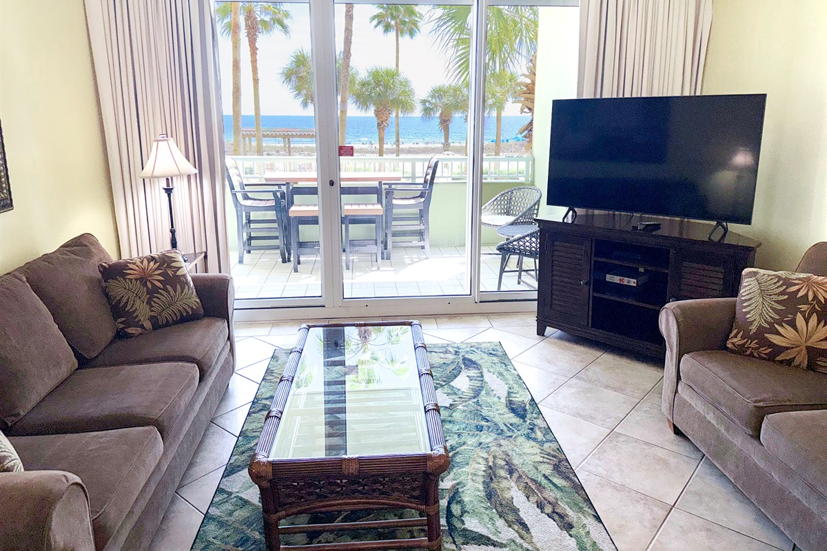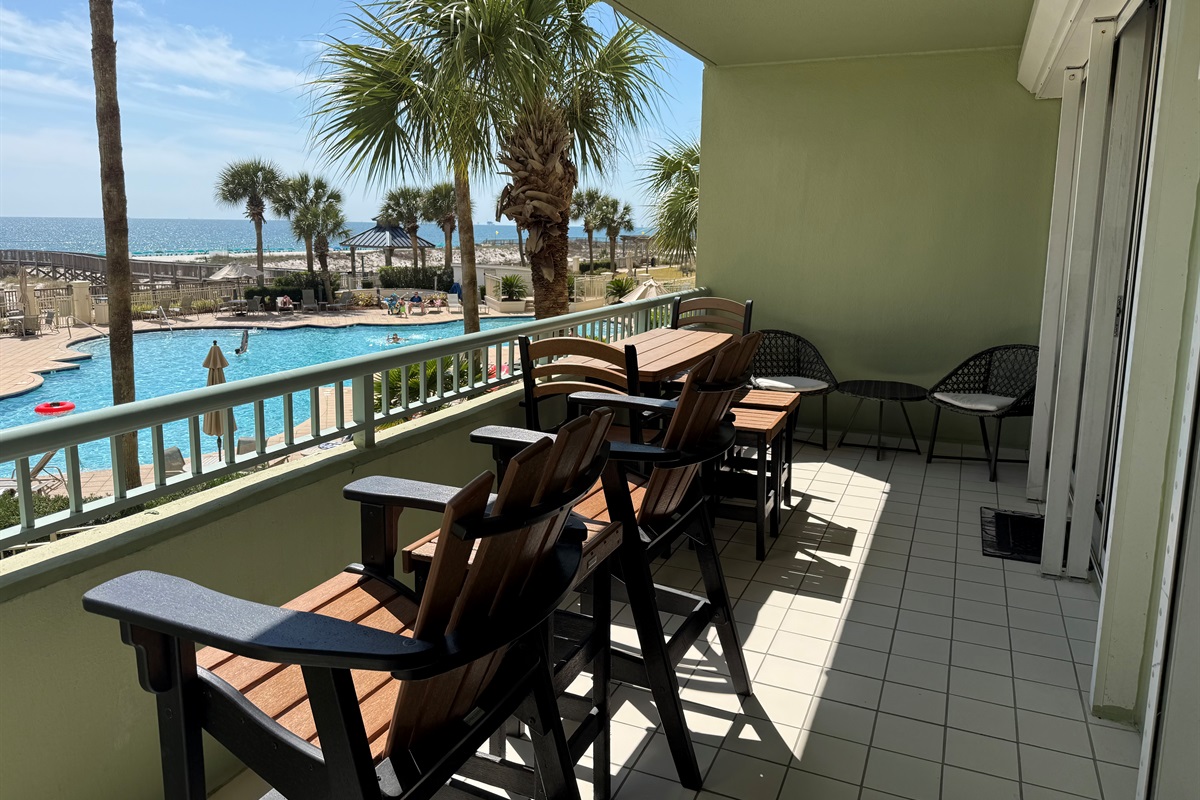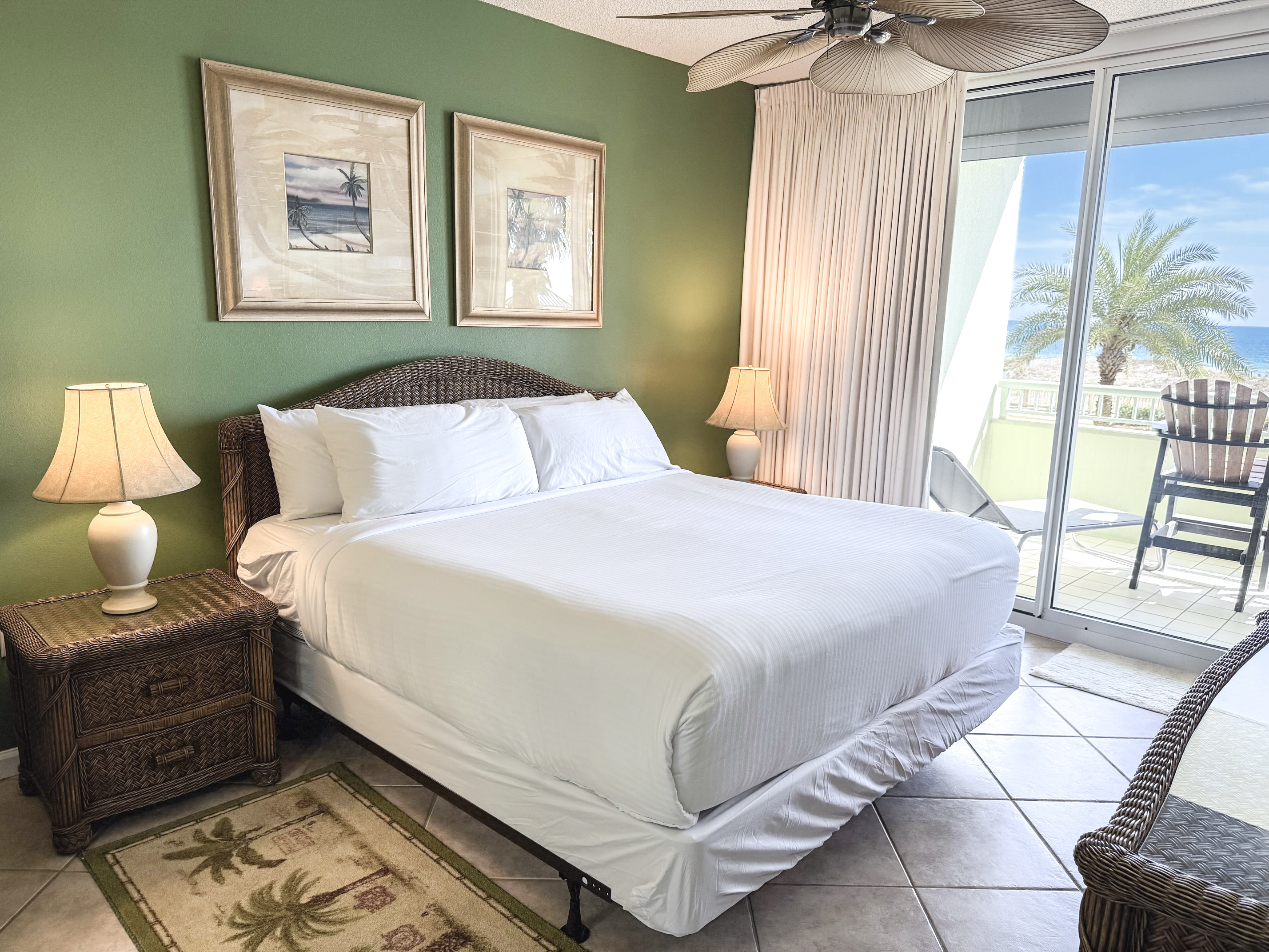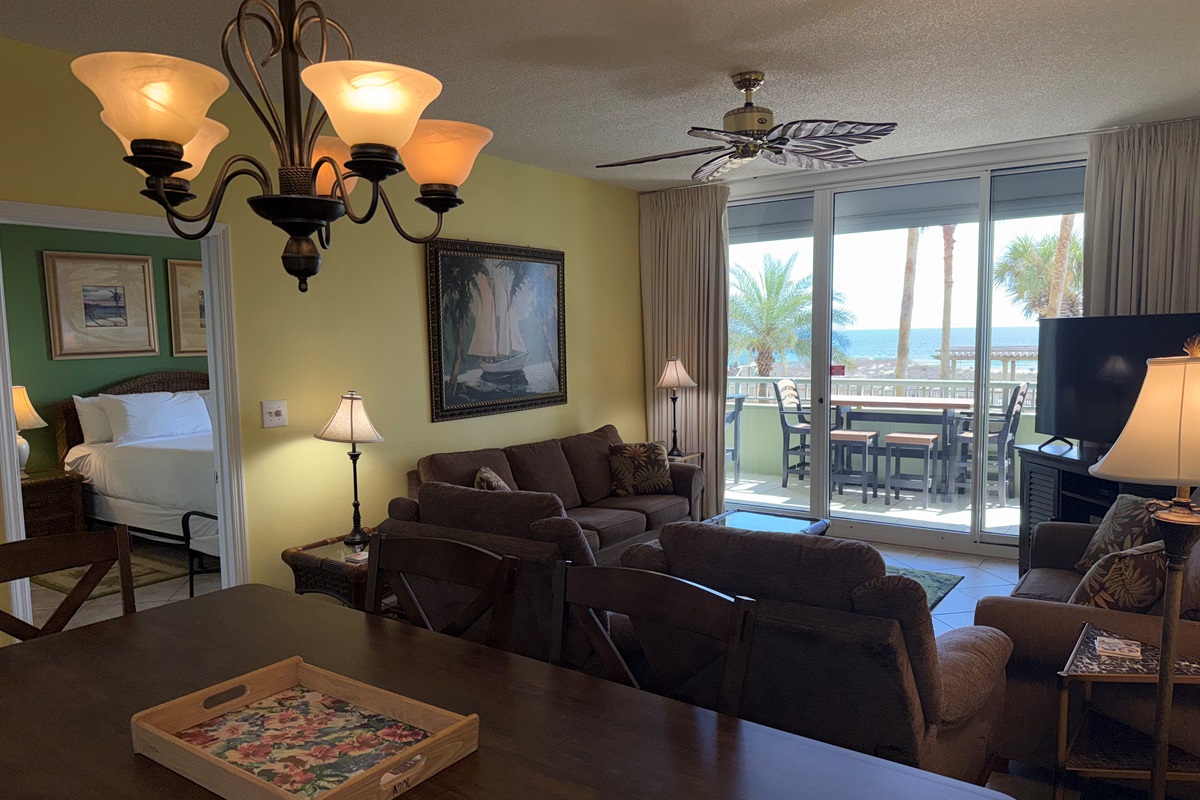 Bedding arrangement is King Master, 2 twin beds, plus a sofa sleeper. All privately adjoin a full bath, plus there is a hall half bath. The master bedroom and the living room adjoin the balcony with a direct Gulf View!