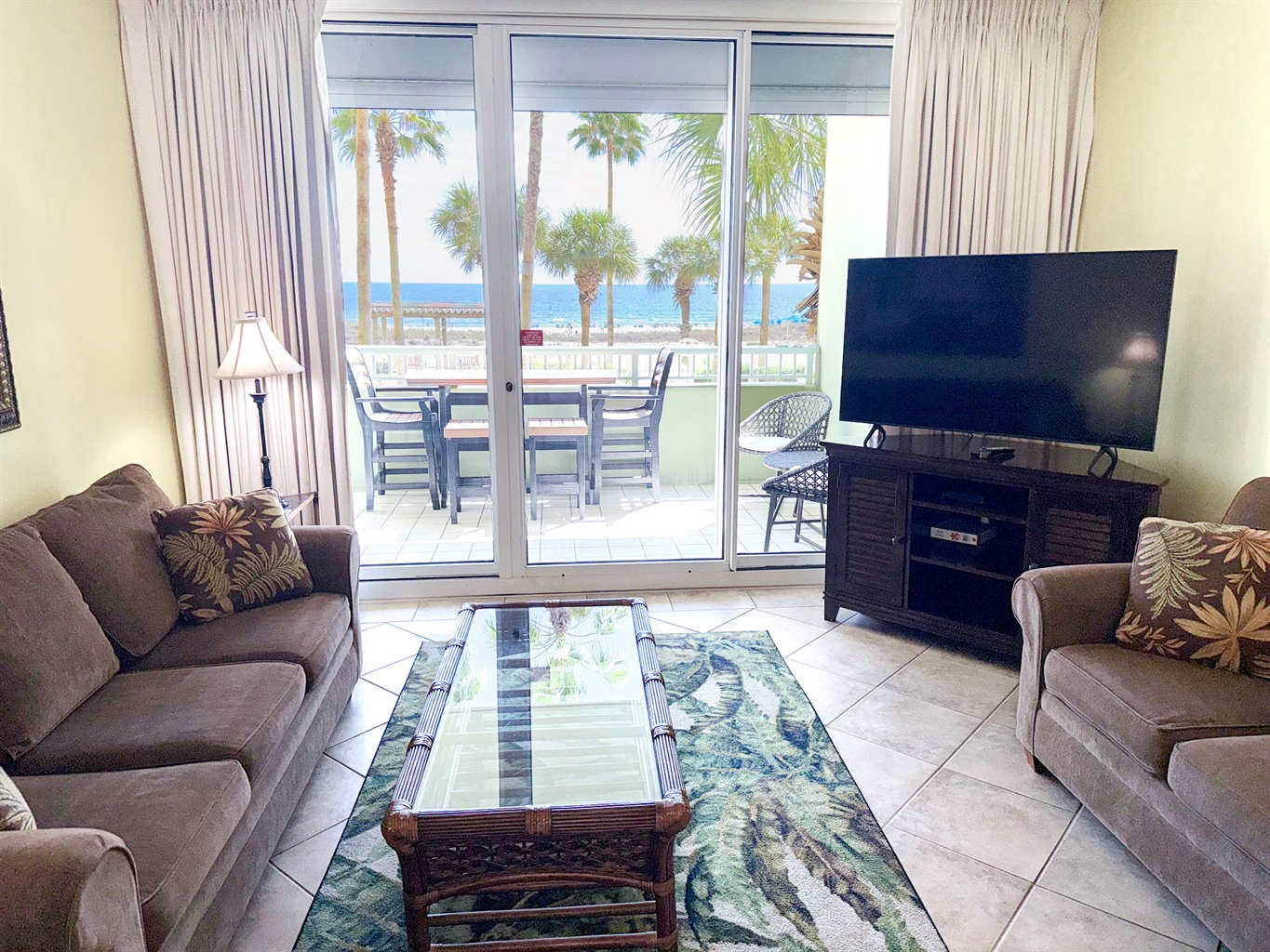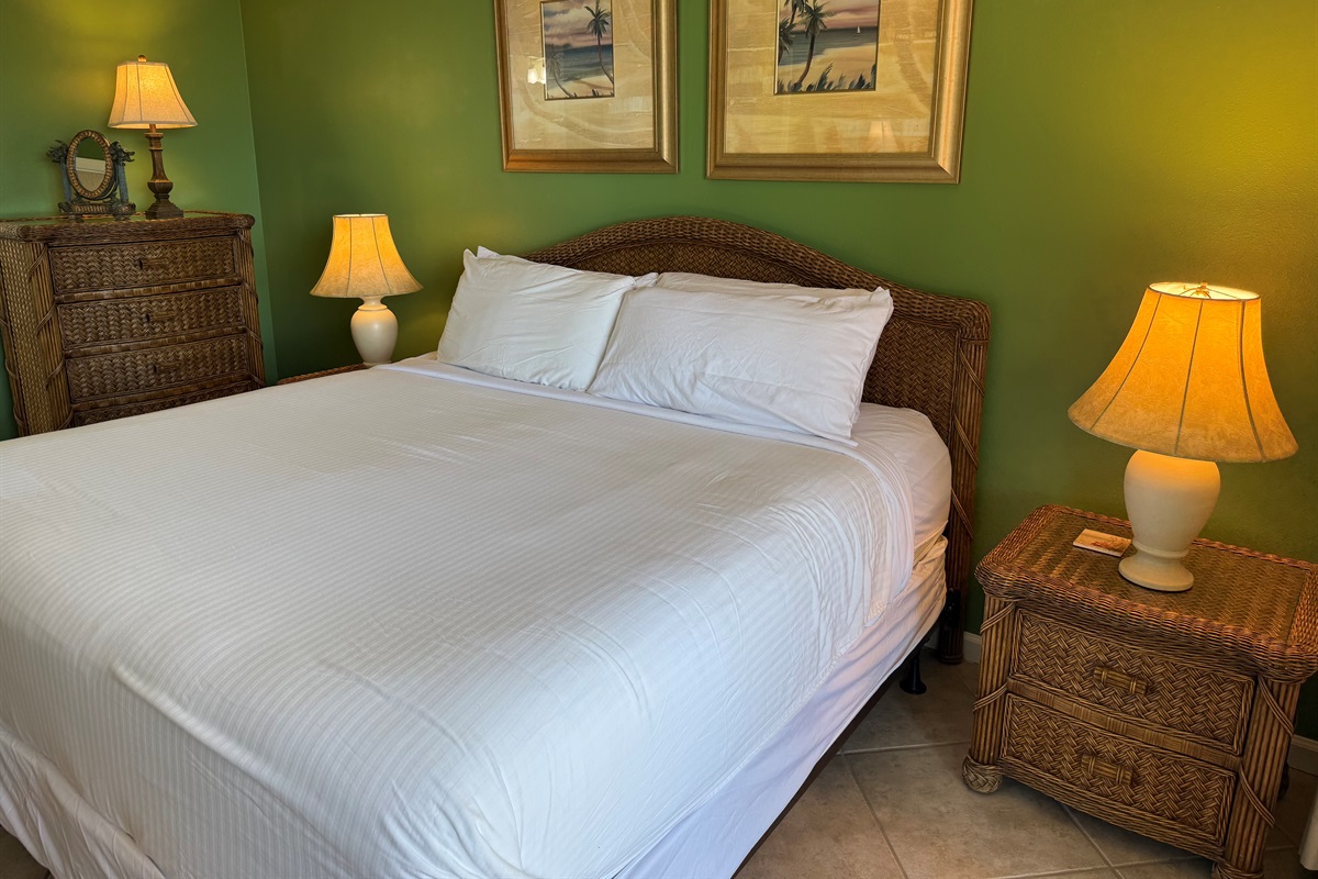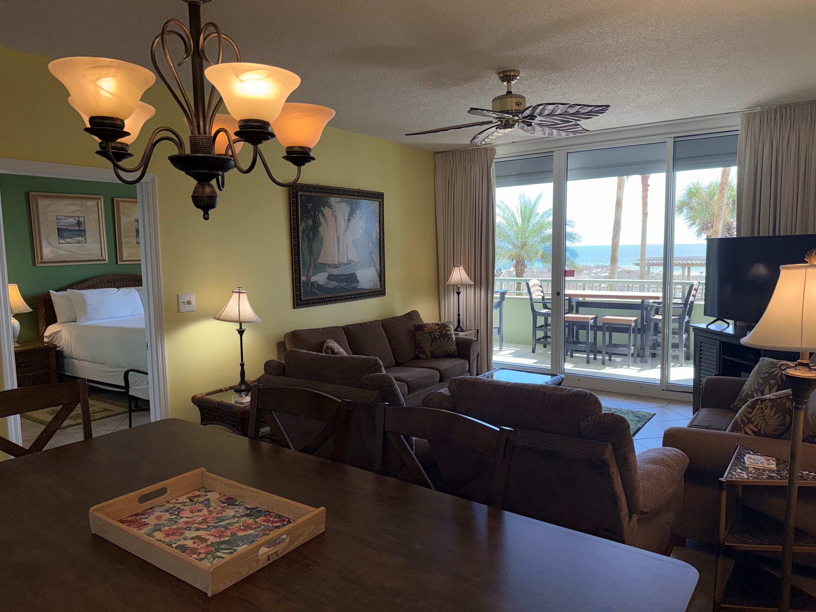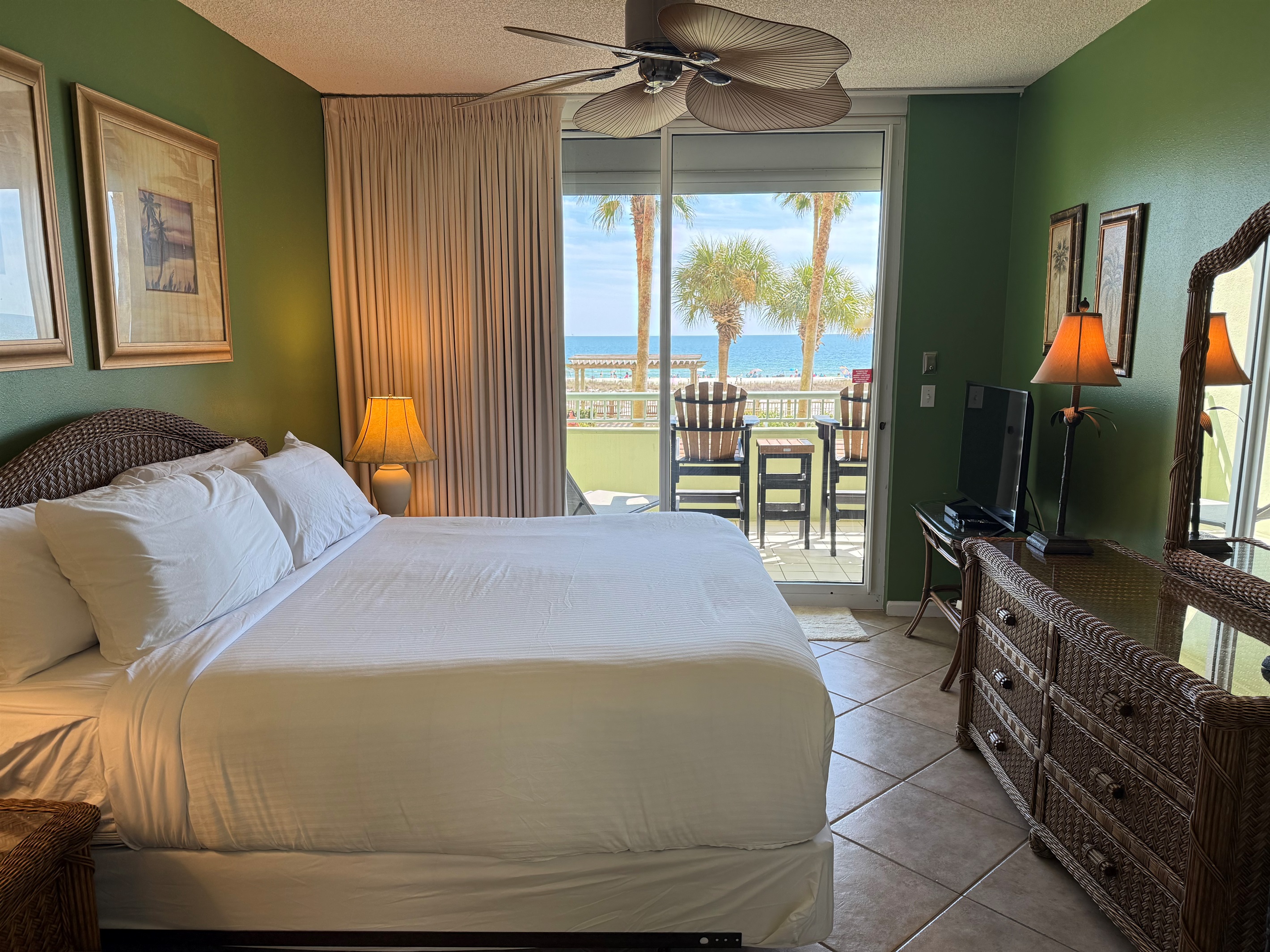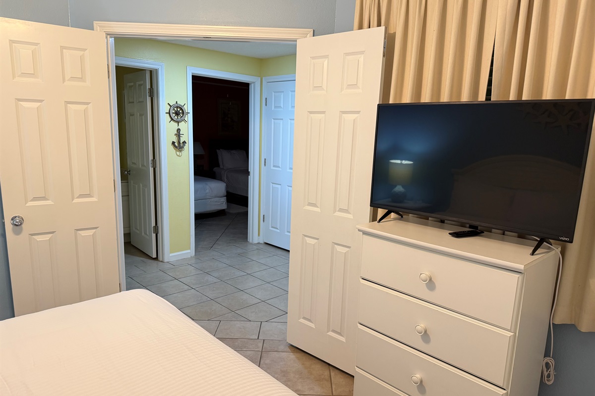 Bedding arrangement is King Master, 2 twin beds, plus a sofa sleeper. All privately adjoin a full bath, plus there is a hall half bath. The master bedroom and the living room adjoin the balcony with a direct Gulf View!