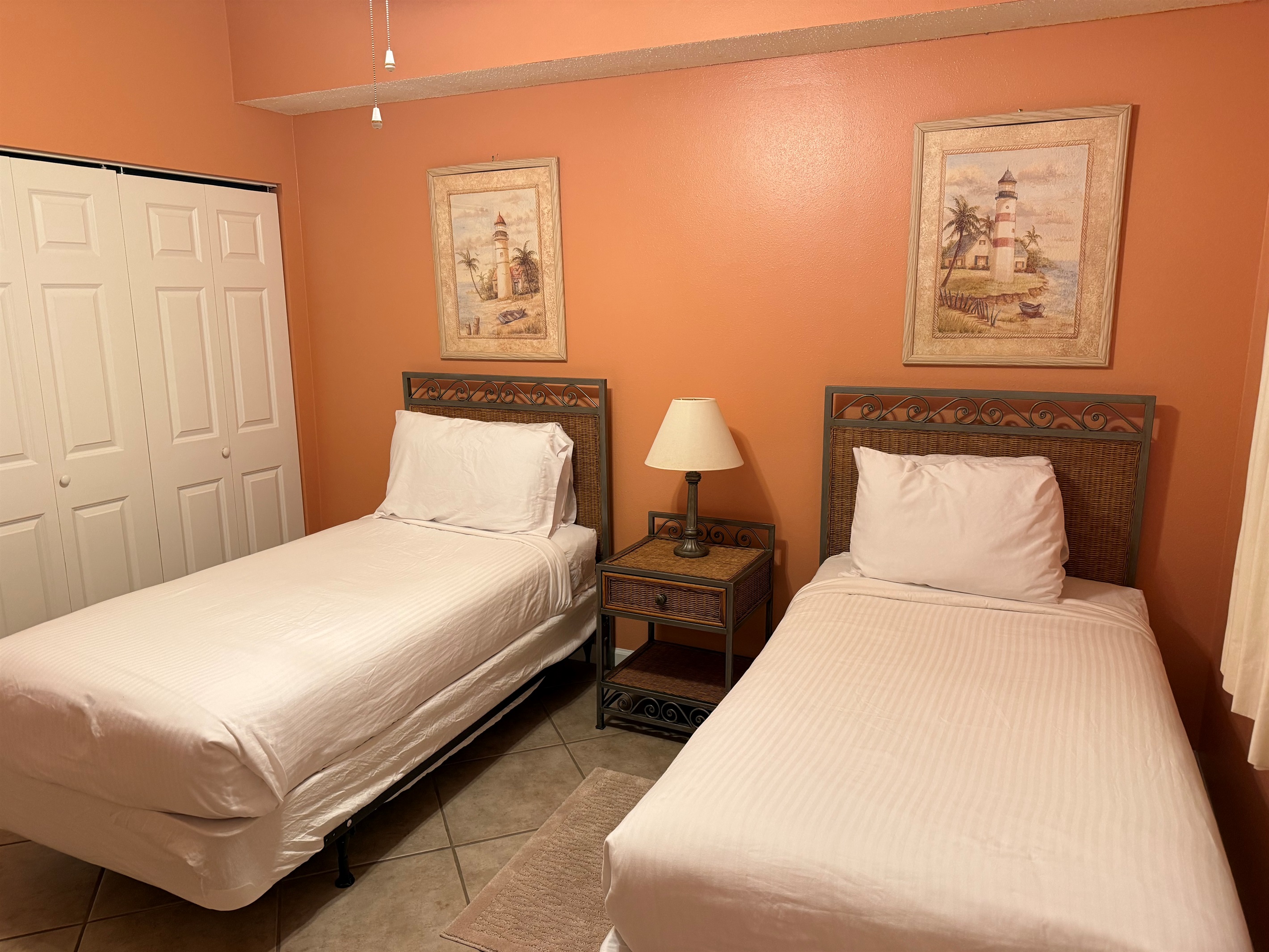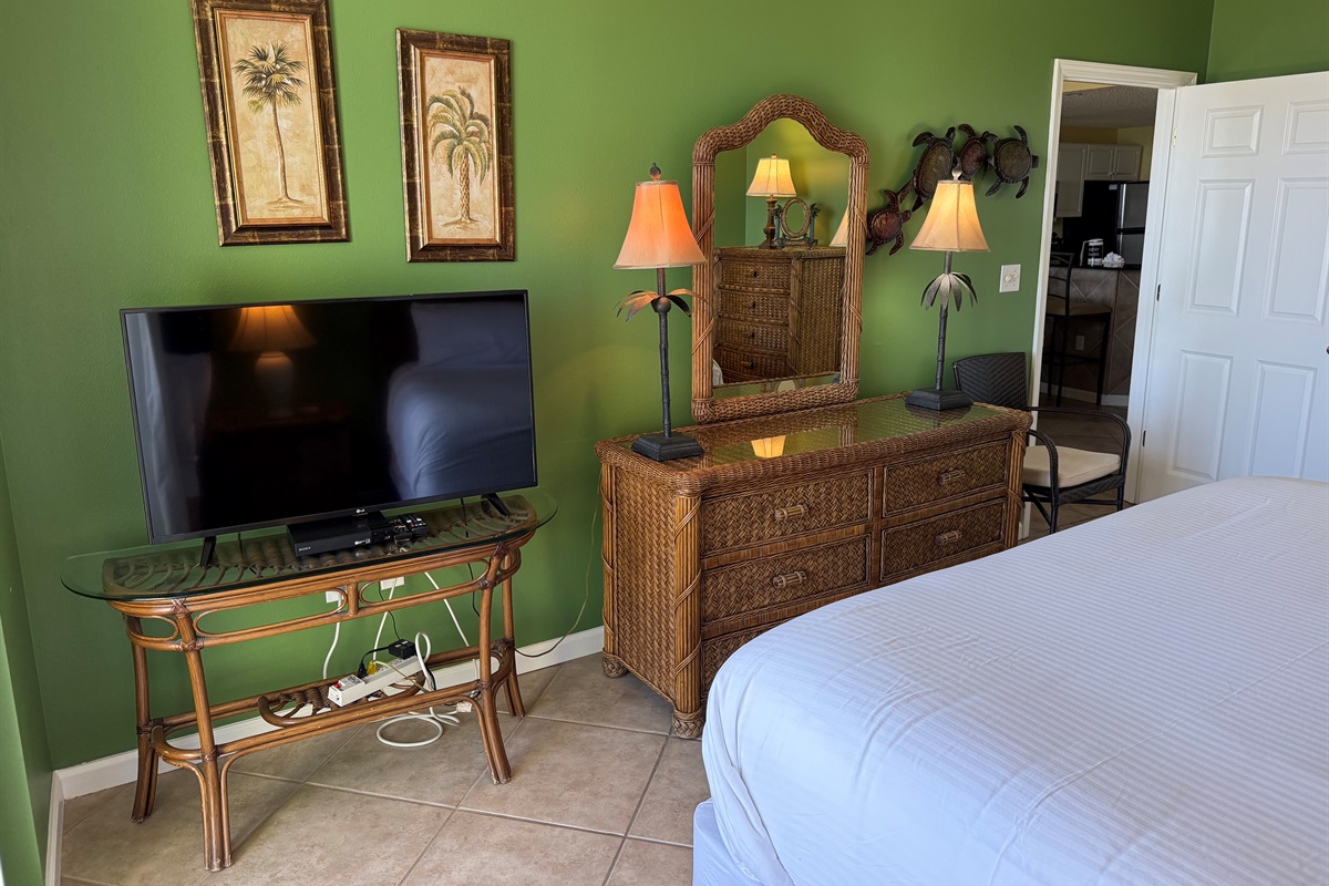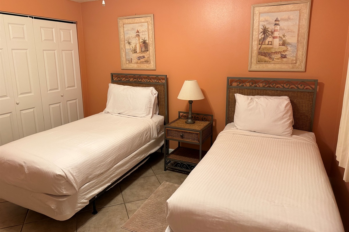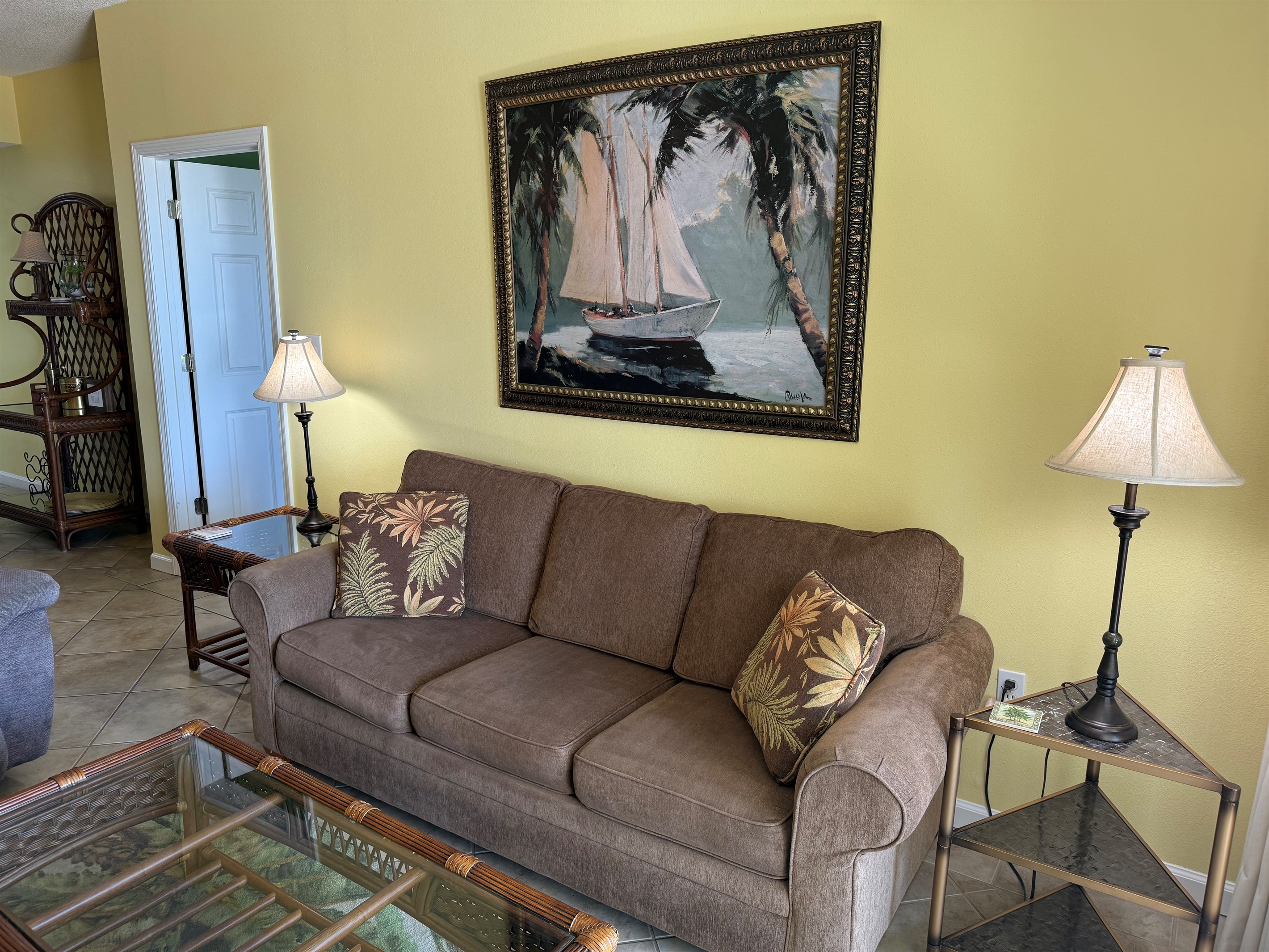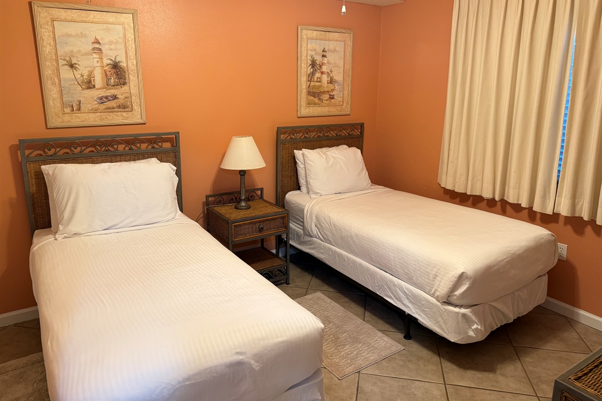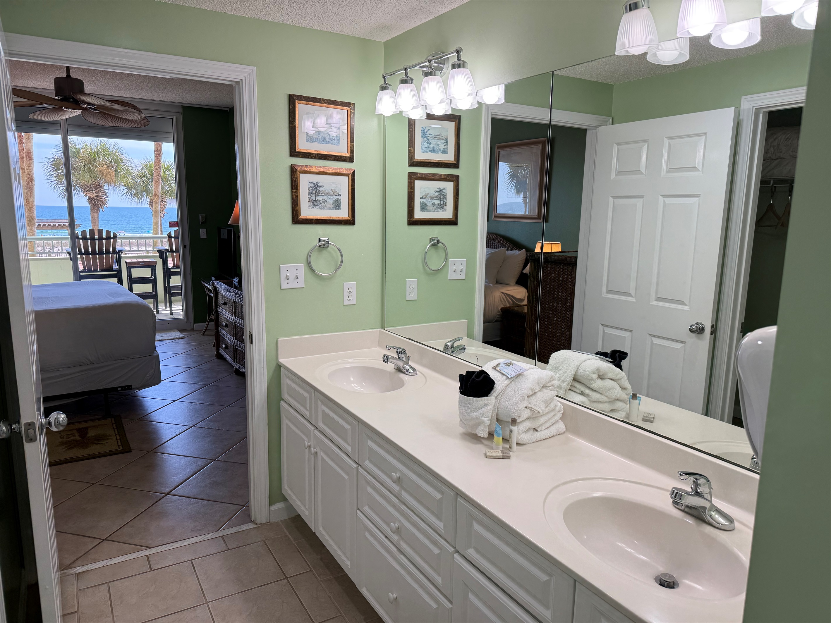Bedding arrangement is King Master, 2 twin beds, plus a sofa sleeper. All privately adjoin a full bath, plus there is a hall half bath. The master bedroom and the living room adjoin the balcony with a direct Gulf View!
