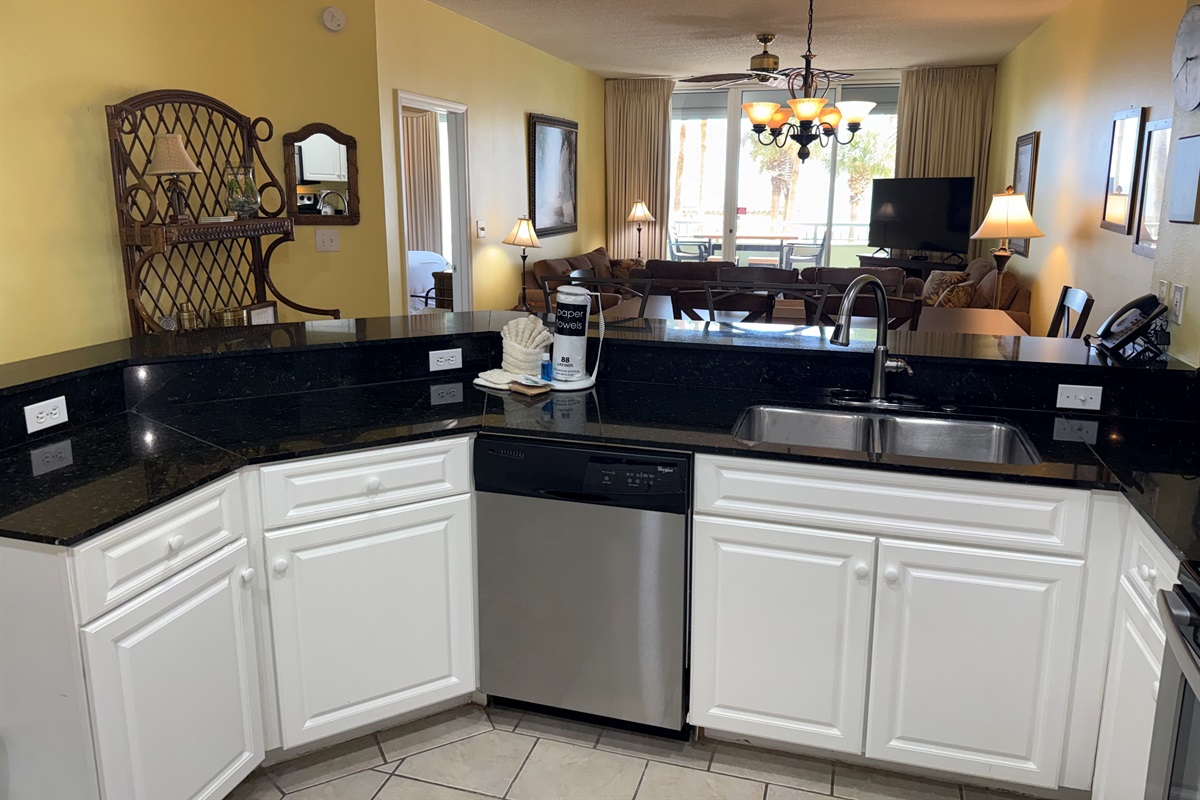 The kitchen has full size appliances including a dishwasher plus a blender, toaster, can opener, and coffee maker. The cabinets are stocked with dishware, utensils, and cookware.