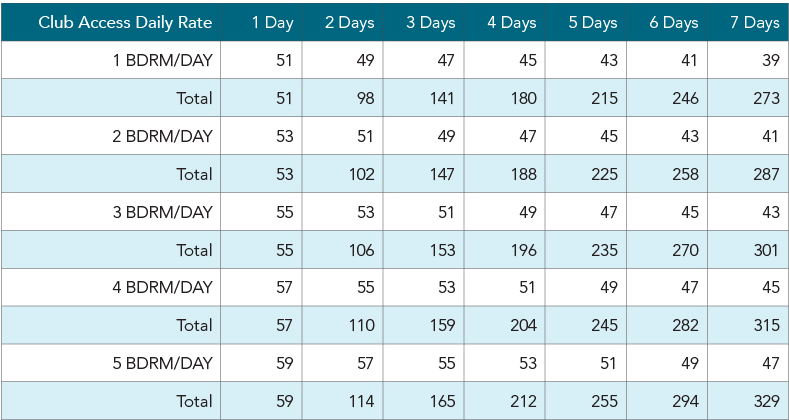 Amenities and pricing chart provided by The Club Director below. The fee below covers everyone in your condo for the day. |